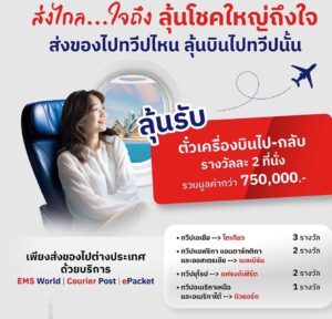 บริษัท ไปรษณีย์ไทย จำกัด เปิดศักราชใหม่ด้วยแคมเปญสุดเซอร์ไพรส์ “ส่งของไปทวีปไหน ลุ้นบินไปทวีปนั้น” แจกตั๋วเครื่องบิน 4 ปลายทางยอดนิยม ให้ผู้ใช้บริการที่ส่งพัสดุไปต่างประเทศได้ลุ้นบินฟรีไป-กลับ 4 ปลายทาง ได้แก่ โตเกียว เมลเบิร์น แฟรงก์เฟิร์ต นิวยอร์ก เพียงส่งสิ่งของไปต่างประเทศด้วยบริการ EMS World บริการ Courier Post และ บริการePacket ตั้งแต่วันที่ 1 ก.พ. – 31 มี.ค.