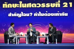 ถัดมาเป็นการเสวนาในหัวข้อ “ทักษะในศตวรรษที่ 21 สำคัญไฉน? ทำไมต้องเท่าทัน” โดยวิทยากรผู้ทรงคุณวุฒิ ทั้งสองท่านได้แก่ศาสตราจารย์กิตติคุณ นายแพทย์สุทธิพร จิตต์มิตรภาพ ประธานศูนย์พัฒนาทรัพยากรมนุษย์เพื่ออนาคต ศูนย์ส่งเสริมผู้มีความสามารถพิเศษ (Hub of Talents) และศูนย์คลังสมองแห่งชาติ (Hub of Knowledge) สำนักงานการวิจัยแห่งชาติ กล่าวว่า การพัฒนาทักษะและความรู้เป็นสิ่งจำเป็นเพื่อให้ทันต่อโลกที่เปลี่ยนแปลงอย่างรวดเร็ว โดยอาศัยการบูรณาการความรู้สหวิทยาการและทักษะที่หลากหลาย เช่น ทักษะด้านเทคโนโลยี การสื่อสาร การบริหาร และการคิดวิเคราะห์ ซึ่งล้วนต้องทำงานร่วมกันเพื่อสร้างความสำเร็จ การเรียนรู้ตลอดชีวิตเป็นสิ่งสำคัญ โดยเฉพาะการใช้เทคโนโลยีดิจิทัลและ AI ให้เกิดประโยชน์สูงสุด ในภาคการแพทย์ เทคโนโลยีช่วยเพิ่มประสิทธิภาพการรักษาและความแม่นยำในการผ่าตัด เช่น เลเซอร์ อัลตราซาวด์ และหุ่นยนต์ผ่าตัด นอกจากนี้ ความสามารถในการคิดสร้างสรรค์ การทำงานเป็นทีม และการตัดสินใจอย่างมีเหตุผลก็เป็นสิ่งสำคัญ ทักษะความเป็นผู้นำและการเป็นผู้ประกอบการช่วยให้สามารถแข่งขันและสร้างสรรค์สิ่งใหม่ ๆ ได้ ความเข้าใจในวัฒนธรรมที่หลากหลายและจริยธรรมเป็นหัวใจสำคัญของการทำงานร่วมกัน สุดท้ายนี้การบูรณาการความรู้และทักษะอย่างต่อเนื่องคือกุญแจสู่ความสำเร็จในยุคที่ทุกอย่างเปลี่ยนแปลงอย่างรวดเร็ว