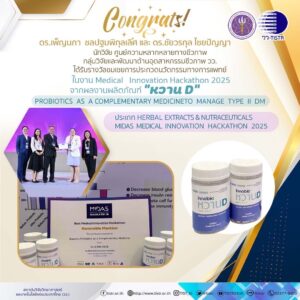 กระทรวงการอุดมศึกษา วิทยาศาสตร์ วิจัยและนวัตกรรม (อว.) สถาบันวิจัยวิทยาศาสตร์และเทคโนโลยีแห่งประเทศไทย (วว.) โดย ดร.เพ็ญนภา ชลปฐมพิกุลเลิศ และดร.ชัยวรกุล ไชยปัญญา นักวิจัย ศูนย์ความหลากหลายทางชีวภาพ กลุ่มวิจัยและพัฒนาด้านอุตสาหกรรมชีวภาพ วว. ได้รับรางวัลชมเชยจากการประกวดนวัตกรรมทางการแพทย์ ในงาน Medical Innovation Hackathon 2025 จากผลงานผลิตภัณฑ์ “หวาน D” หรือ PROBIOTICS AS A COMPLEMENTARY MEDICINE TO MANAGE TYPE II DM ในประเภท HERBAL EXTRACTS & NUTRACEUTICALS MIDAS MEDICAL INNOVATION HACKATHON 2025 เมื่อวันที่ 16 ก.พ. ที่โรงแรมพูลแมน คิงเพาเวอร์ กรุงเทพ (รางน้ำ)