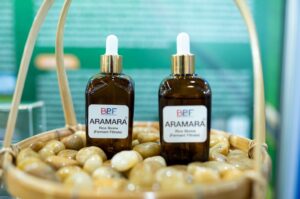 ดร.ธนธรรศ สนธีระ อุปนายกสมาคมการค้าคลัสเตอร์เครื่องสำอางไทย (Thai Cosmetic Cluster: TCOS) และกรรมการผู้จัดการบริษัท สยาม เนเชอรัล โปรดักซ์ จำกัด เน้นถึงความสำคัญของการยกระดับอุตสาหกรรมเครื่องสำอางไทยด้วยวิทยาศาสตร์และนวัตกรรม ซึ่งเป็นโอกาสสำคัญในการเพิ่มขีดความสามารถในการแข่งขันของผู้ประกอบการไทยในตลาดสากล และประยุกต์ใช้เทคโนโลยีสมัยใหม่เพิ่มมูลค่าให้กับผลิตภัณฑ์ โดยนวัตกรรมเวชสำอางจากข้าวไทย ภายใต้เครื่องหมายทางการค้า “ARAMARA” เป็นนวัตกรรมสารสกัดธรรมชาติจากข้าวหอมมะลิอินทรีย์และต้นข้าวอ่อนหมัก (Rice ferment filtrate) ที่มีเอกลักษณ์ ได้รับการพัฒนาขึ้นด้วยเทคโนโลยีสีเขียวที่ผนวกเทคโนโลยีการหมักแบบแม่นยำ เข้ากับกระบวนการสกัดและกระบวนการปลายน้ำที่ไม่ใช้สารเคมีหรือความร้อน ทำให้มีคุณสมบัติที่ดีและโดดเด่นเหมาะกับการนำไปใช้เป็นส่วนประกอบฟังก์ชันในผลิตภัณฑ์เครื่องสำอาง ซึ่งสารสกัด “ARAMARA” ประกอบด้วยสารต้านอนุมูลอิสระ สารช่วยผลัดเซลล์ผิวและลดเลือนริ้วรอย รวมถึงมีฤทธิ์ต้านจุลินทรีย์ก่อโรคผิวหนัง ปัจจุบัน บริษัทได้ต่อยอดพัฒนาสารสกัด “ARAMARA” ไปใช้เป็นส่วนประกอบสำคัญในผลิตภัณฑ์ดูแลผิว ซึ่งได้รับการจดแจ้งผลิตภัณฑ์ภายใต้แบรนด์ “ดร.เอจจี้ (Dr. Agei)” เพื่อการผลิตและจำหน่ายเชิงพาณิชย์