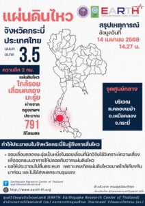 กระทรวงการอุดมศึกษา วิทยาศาสตร์ วิจัยและนวัตกรรม(อว.) โดยสำนักงานการวิจัยแห่งชาติ (วช.) และศูนย์วิจัยแผ่นดินไหวแห่งชาติ (EARTH: Earthquake Research Center of Thailand) ร่วมให้ข้อมูลสรุปเหตุการณ์แผ่นดินไหว วันที่ 14 เม.ย.เวลา 14.27 น. ขนาด 3.5 ที่จ.กระบี่ ใกล้รอยเลื่อนคลองมะรุ่ย