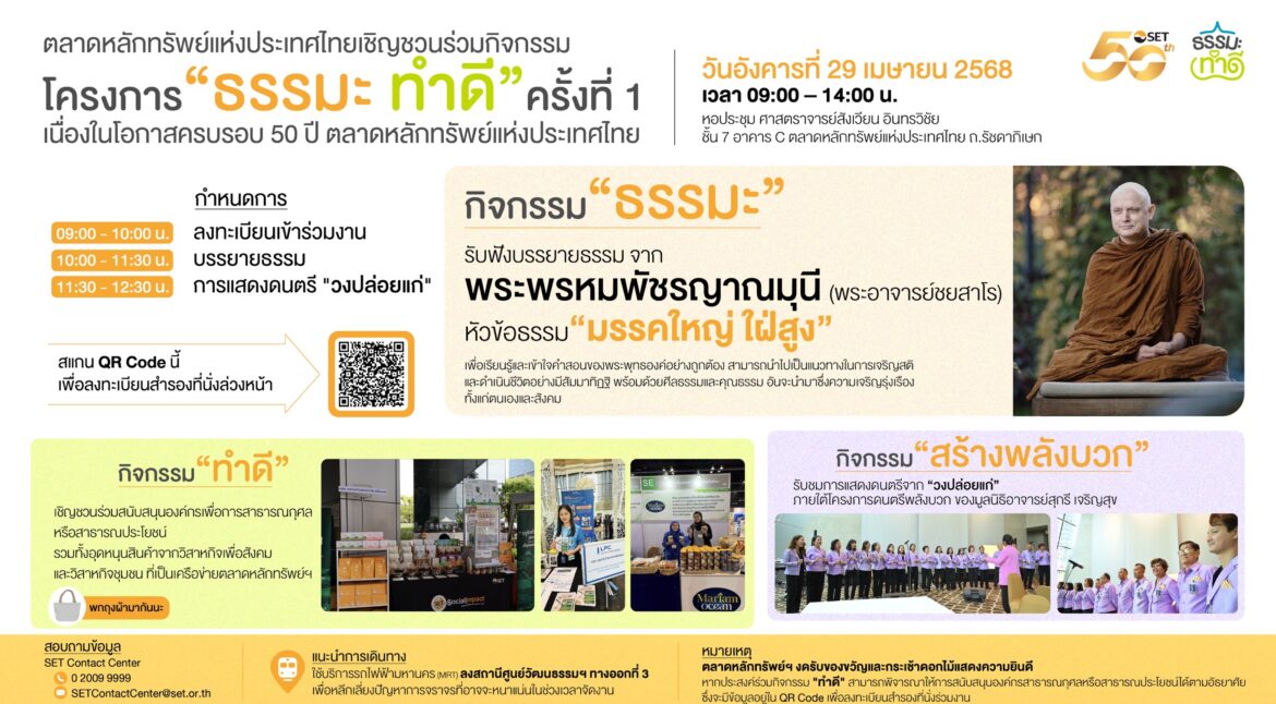 เชิญร่วมงาน “ธรรมะ ทำดี” เนื่องในโอกาสครบรอบ 50 ปี ตลาดหลักทรัพย์ฯ”