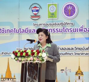 วันอาทิตย์ที่ 20 เมษายน 2568 สำนักงานการวิจัยแห่งชาติ (วช.) กระทรวงการอุดมศึกษา วิทยาศาสตร์ วิจัยและนวัตกรรม ร่วมกับเทศบาลเมืองศรีราชา จ.ชลบุรี จัดการอบรมเชิงปฏิบัติการ “การประยุกต์ใช้เทคโนโลยีและนวัตกรรมโดรนเพื่อส่งเสริมการท่องเที่ยว ภาคตะวันออก” โดย ดร.วิภารัตน์ ดีอ่อง ผู้อำนวยการสำนักงานการวิจัยแห่งชาติ ให้เกียรติเป็นประธาน โดยมีนายยุทธนา ใจดี รองปลัดเทศบาลเมืองศรีราชา กล่าวสนับสนุนและต้อนรับ พร้อมผู้บริหารในพื้นที่ ผู้ทรงคุณวุฒิ วช. และคณาจารย์เข้าร่วมกิจกรรม ประกอบด้วย อาจารย์นิรันดร์ พิทักษ์มงคล รักษาการผู้อำนวยการวิทยาลัยอาชีวศึกษาศรีราชา, อาจารย์พิศิษฐ์ มิตรเกื้อกูล นายกสมาคมกีฬาเครื่องบินจำลองและวิทยุบังคับ และผู้บริหารของจังหวัด ณ วิทยาลัยอาชีวศึกษาศรีราชา จังหวัดชลบุรี