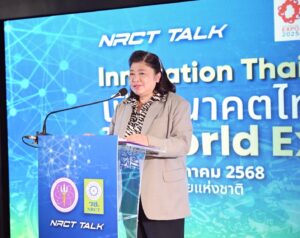 การเข้าร่วมงาน World Expo 2025 ในครั้งนี้ วช. ได้นำนักวิจัยและผู้ประกอบการเข้าร่วมจัดแสดงและจำหน่ายผลิตภัณฑ์ภายใน Thailand Pavillion ณ World Expo 2025 มาร่วมเสวนาในการแถลงข่าว “NRCT Talk : Innovation Thailand เปิดอนาคตไทยใน World Expo 2025“ เพื่อนำเสนอผลิตภัณฑ์นวัตกรรมต่างๆที่จะนำไปงาน World Expo 2025