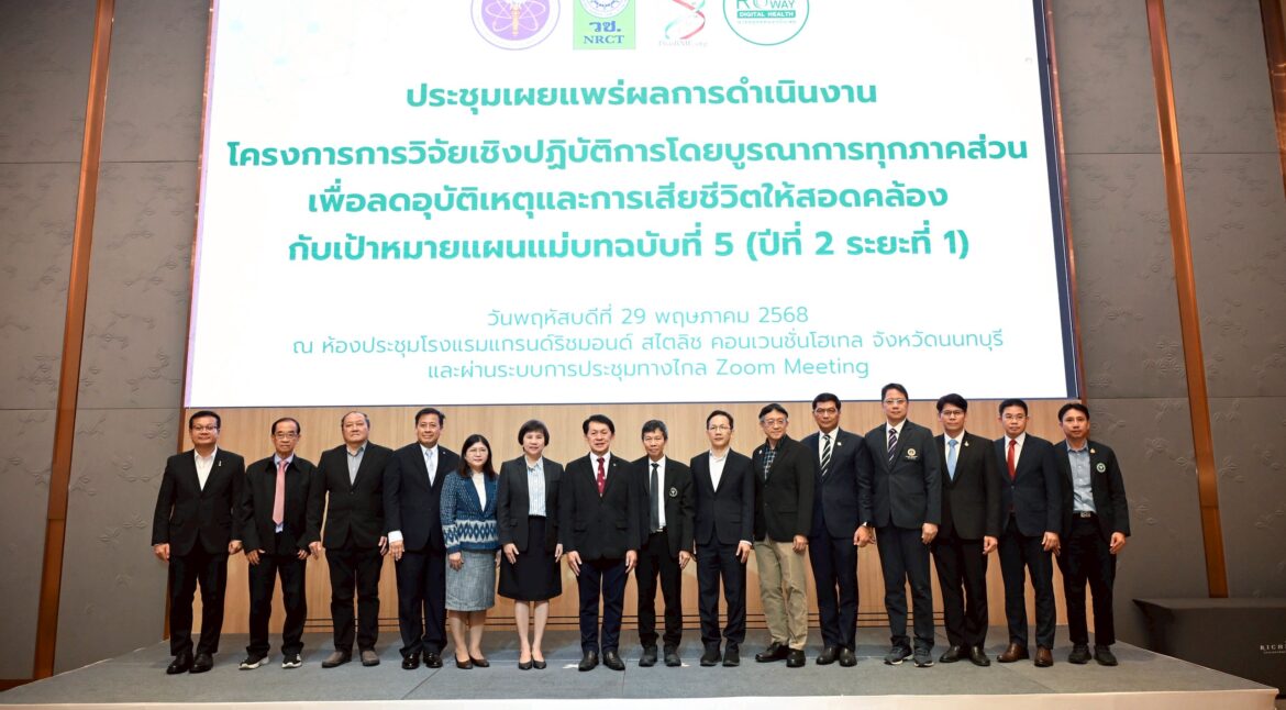 วันที่ 29 พฤษภาคม 2568 สำนักงานการวิจัยแห่งชาติ (วช.) กระทรวงการอุดมศึกษา วิทยาศาสตร์ วิจัยและนวัตกรรม สนับสนุนสมาคมวิศวกรรมชีวการแพทย์ไทย จัดการประชุมเผยแพร่ผลการดำเนินงานโครงการการวิจัยเชิงปฏิบัติการโดยบูรณาการทุกภาคส่วนเพื่อลดอุบัติเหตุและการเสียชีวิตให้สอดคล้องกับเป้าหมายแผนแม่บทฉบับที่ 5 (ปีที่ 2 : ระยะที่ 1) โดย ดร.วิภารัตน์ ดีอ่อง ผู้อำนวยการสำนักงานการวิจัยแห่งชาติ มอบหมายให้ นางสาวเสาวนีย์ มุ่งสุจริตการ รองผู้อำนวยการสำนักงานการวิจัยแห่งชาติ เป็นประธานและมอบนโยบายการผลักดันงานวิจัยเพื่อความปลอดภัยทางถนน พร้อมด้วย นายแพทย์ชาญวิทย์ ทระเทพ หัวหน้าโครงการวิจัยฯ กล่าวรายงาน ณ ห้องประชุมโรงแรมแกรนด์ ริชมอนด์ สไตลิช คอนเวนชั่น โฮเทล จังหวัดนนทบุรี