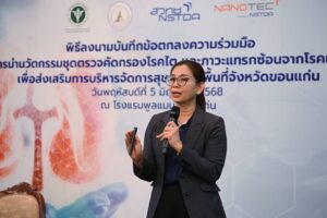 5 มิถุนายน 2568 ณ โรงแรมพูลแมน ขอนแก่น – กระทรวงการอุดมศึกษา วิทยาศาสตร์ วิจัยและนวัตกรรม (อว.) สำนักงานพัฒนาวิทยาศาสตร์และเทคโนโลยีแห่งชาติ (สวทช.) โดย ศูนย์นาโนเทคโนโลยีแห่งชาติ (นาโนเทค) ร่วมกับสำนักงานสาธารณสุขจังหวัดขอนแก่น และองค์การบริหารส่วนจังหวัดขอนแก่น ลงนามความร่วมมือด้าน “การนำนวัตกรรมชุดตรวจคัดกรองโรคไต และภาวะแทรกซ้อนจากโรคเบาหวาน เพื่อส่งเสริมการบริหารจัดการสุขภาพในพื้นที่จังหวัดขอนแก่น” โดยมีเป้าหมายเพื่อจัดกิจกรรมอบรมการใช้ชุดตรวจคัดกรองโรคไตให้แก่บุคลากรทางการแพทย์และเจ้าหน้าที่โรงพยาบาลส่งเสริมสุขภาพตำบล ครอบคลุมทั้ง 248 แห่งในจังหวัดขอนแก่น เพื่อขับเคลื่อนการใช้ชุดตรวจคัดกรองอย่างครอบคลุมทั่วทั้งจังหวัด เป็นการนำร่อง ‘ขอนแก่นโมเดล’ ซึ่งตั้งเป้าขยายผลสู่ระดับประเทศภายในปี 2571 เพื่อยกระดับสุขภาวะของประชาชนไทยด้วยนวัตกรรมทางการแพทย์ที่ทันสมัย เข้าถึงง่าย และตอบโจทย์ความต้องการในพื้นที่