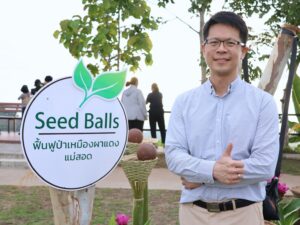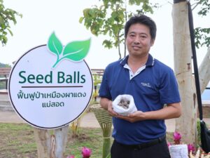 ดร.สิทธิโชค ตั้งภัสสรเรือง รองผู้อำนวยการศูนย์พันธุวิศวกรรมและเทคโนโลยีชีวภาพแห่งชาติ (ไบโอเทค) สวทช. กล่าวว่า ไบโอเทค สวทช. ได้ส่งมอบกล้าไผ่รวกใหญ่ให้กับโครงการฯ เพื่อใช้ในการฟื้นฟูสภาพป่า โดยกล้าไผ่นี้เป็นผลผลิตจากโครงการคัดเลือกไผ่รู้อายุพันธุ์ดี และการใช้นวัตกรรมเทคโนโลยีการเพาะเลี้ยงเนื้อเยื่อพืชในห้องปฏิบัติการ ทำให้ได้กล้าไผ่ที่มีคุณภาพดี สม่ำเสมอ ปลอดโรค ซึ่งจะช่วยให้การวางแผนการปลูกและการคาดการณ์การเจริญเติบโตแม่นยำยิ่งขึ้น ส่งผลให้การฟื้นฟูป่ารวดเร็วกว่าเดิม รวมถึง “Seed balls” ซึ่งเป็นอีกหนึ่งผลงานวิจัยของไบโอเทค โดย Seed balls คือการนำเมล็ดพันธุ์ไม้ป่ามาห่อหุ้มด้วยดินเหนียวและสารอาหารที่จำเป็น ทำหน้าที่เป็นเกราะคุ้มกันและเสบียงอาหารให้แก่เมล็ดพันธุ์ ช่วยปกป้องจากศัตรูพืชและสภาพอากาศแห้งแล้ง อีกทั้งยังเพิ่มอัตราการงอกให้สูงขึ้น ทำให้ปลูกป่าได้ง่ายขึ้น เพียงแค่นำไปวางหรือโยนในพื้นที่เป้าหมายก็สามารถเติบโตเป็นต้นไม้ใหญ่ได้