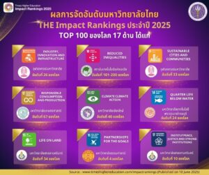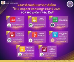 เมื่อวันที่ 24 มิ.ย. ศ.ดร.ศุภชัย ปทุมนากุล ปลัดกระทรวงการอุดมศึกษา วิทยาศาสตร์ วิจัยและนวัตกรรม (อว.) เปิดเผยว่า Times Higher Education (THE) หน่วยงานด้านการจัดอันดับสถาบันอุดมศึกษาชั้นนำของโลก ได้ประกาศผลการจัดอันดับสถาบันอุดมศึกษาที่มีการดำเนินงานเพื่อสนับสนุนเป้าหมายการพัฒนาที่ยั่งยืน (Sustainable Development Goals: SDGs) หรือ THE Impact Rankings ประจำปี 2568 โดยในปีนี้มีสถาบันอุดมศึกษาทั่วโลก เข้าร่วมการจัดอันดับทั้งหมด 2,526 แห่ง จาก 130 ประเทศและเขตเศรษฐกิจทั่วโลก และมีสถาบันอุดมศึกษาไทยเข้ารับการจัดอันดับทั้งสิ้น 83 แห่ง เพิ่มจากปี 2567 ซึ่งมีจำนวน 77 แห่ง ซึ่งผลการจัดอันดับปรากฎว่า มี 5 สถาบันอุดมศึกษาไทยอยู่ในอันดับ Top 100 ของโลก แบบคะแนนรวม ได้แก่ จุฬาลงกรณ์มหาวิทยาลัยและมหาวิทยาลัยเชียงใหม่(มช.) อันดับที่ 44 มหาวิทยาลัยมหิดลและมหาวิทยาลัยธรรมศาสตร์(มธ.) อันดับที่ 64 และมีมหาวิทยาลัยวลัยลักษณ์ อันดับที่ 93 ซึ่งขยับมาอยู่ในอันดับ Top 100 เป็นปีแรก อีกทั้งยังเป็นสถาบันอุดมศึกษาอันดับ 1 ของโลกที่ได้รับคะแนนสูงสุดในการดำเนินงาน SDGs เป้าหมายที่ 5 ความเท่าเทียมทางเพศ (Gender equality)