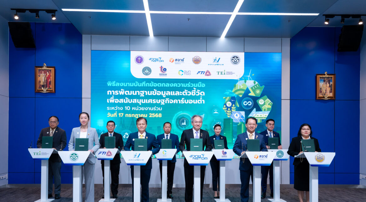 วันที่ 17 กรกฎาคม 2568 ที่ห้องแถลงข่าว ชั้น 1 อาคารพระจอมเกล้า กระทรวงการอุดมศึกษา วิทยาศาสตร์ วิจัยและนวัตกรรม ถนนพระราม 6 กรุงเทพฯ: ศาสตราจารย์ ดร.ชูกิจ ลิมปิจำนงค์ ผู้อำนวยการสำนักงานพัฒนาวิทยาศาสตร์และเทคโนโลยีแห่งชาติ (สวทช.) พร้อมด้วย รองศาสตราจารย์ ดร.เติมศักดิ์ ศรีคิรินทร์ ผู้อำนวยการศูนย์เทคโนโลยีโลหะและวัสดุแห่งชาติ สังกัดกระทรวงการอุดมศึกษา วิทยาศาสตร์ วิจัยและนวัตกรรม (อว.) ลงนามบันทึกข้อตกลง “ความร่วมมือการพัฒนาฐานข้อมูลและตัวชี้วัดเพื่อสนับสนุนเศรษฐกิจคาร์บอนต่ำ” ร่วมกับผู้บริหารจาก 9 หน่วยงาน ประกอบด้วย รองศาสตราจารย์ วงกต วงศ์อภัย รองผู้อำนวยการสำนักงานสภานโยบายการอุดมศึกษา วิทยาศาสตร์ วิจัยและนวัตกรรมแห่งชาติ (สอวช.) นายดนุชา พิชยนันท์ เลขาธิการสภาพัฒนาการเศรษฐกิจและสังคมแห่งชาติ (สศช.) นายภุชพงค์ โนดไธสง ผู้อำนวยการสำนักงานสถิติแห่งชาติ (สสช.) ดร.ชญานันท์ ภักดีจิตต์ เลขาธิการสำนักงานนโยบายและแผนทรัพยากรธรรมชาติและสิ่งแวดล้อม (สผ.) ดร.พิรุณ สัยยะสิทธิ์พานิช อธิบดีกรมการเปลี่ยนแปลงสภาพภูมิอากาศและสิ่งแวดล้อม (สส.) นางสาวณัฏฐิญา เนตยสุภา อธิบดีกรมส่งเสริมอุตสาหกรรม (กสอ.) นายณกรณ์ ตรรกวิรพัท ผู้อำนวยการองค์การบริหารจัดการก๊าซเรือนกระจก (องค์การมหาชน) (อบก.) นายกิตติพงศ์ ลิ่มสุวรรณโรจน์ กรรมการบริหารสถาบันการเปลี่ยนแปลงสภาพภูมิอากาศ สภาอุตสาหกรรมแห่งประเทศไทย (ส.อ.ท.) และ ดร.วิจารย์ สิมาฉายา ผู้อำนวยการมูลนิธิสถาบันสิ่งแวดล้อมไทย (มสท.)
