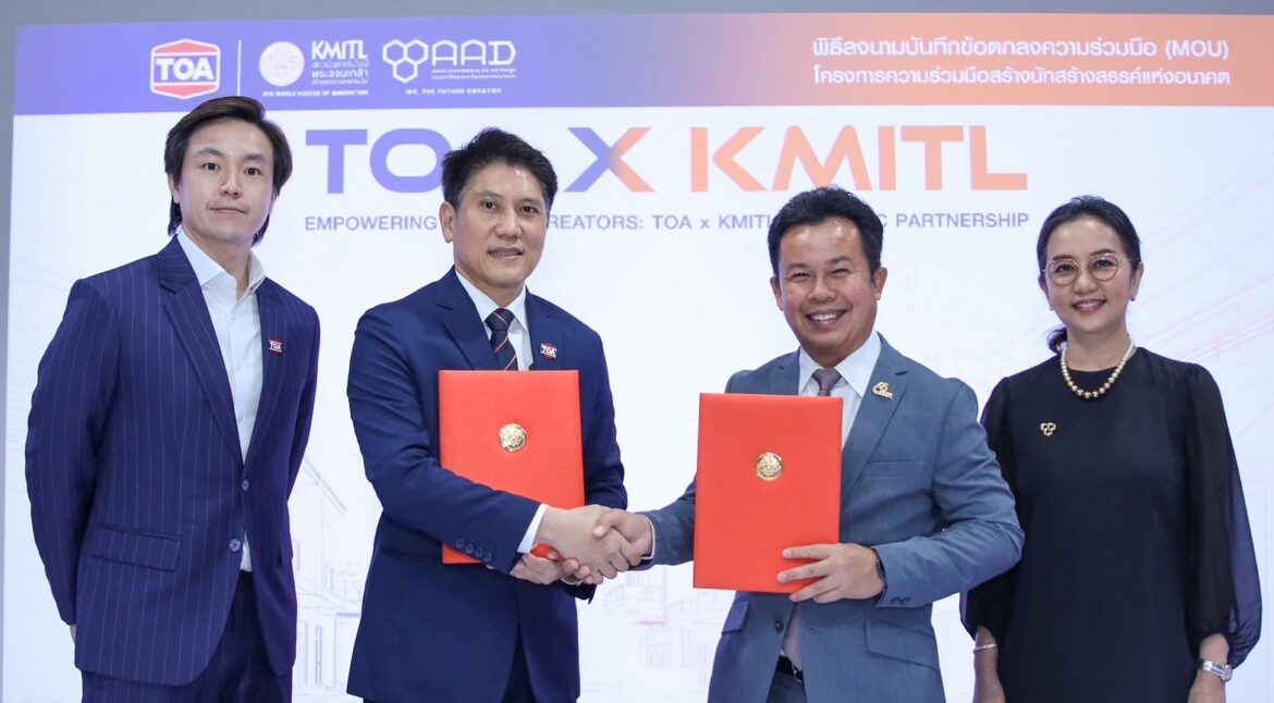 คณะสถาปัตยกรรม ศิลปะและการออกแบบ สถาบันเทคโนโลยีพระจอมเกล้าเจ้าคุณทหารลาดกระบัง (AAD KMITL-สจล.) ร่วมกับ บริษัท ทีโอเอ เพ้นท์ (ประเทศไทย) จำกัด (มหาชน) ลงนามบันทึกข้อตกลงความร่วมมือทางวิชาการ (MOU) ครั้งสำคัญ ผลักดันโครงการความร่วมมือสร้างนักสร้างสรรค์แห่งอนาคต เพื่อยกระดับการเรียนรู้และบ่มเพาะนักออกแบบรุ่นใหม่ สำหรับพิธีลงนามจัดขึ้น ที่คณะสถาปัตยกรรมฯ สจล. โดยมีผู้บริหารระดับสูงของทั้ง 2 องค์กรเข้าร่วมงาน ได้แก่ รศ. ดร.คมสัน มาลีสี อธิการบดี สจล., ผศ.ดร.อันธิกา สวัสดิ์ศรี คณบดีคณะสถาปัตยกรรมฯ , นายจตุภัทร์ ตั้งคารวคุณ ประธานเจ้าหน้าที่บริหาร บริษัท ทีโอเอ เพ้นท์ (ประเทศไทย) จำกัด (มหาชน), นายนพคุณ ปัญญาเสริมสุข ผู้อำนวยการฝ่ายการตลาด บริษัท ทีโอเอ เพ้นท์ฯ เข้าร่วมในการลงนาม
