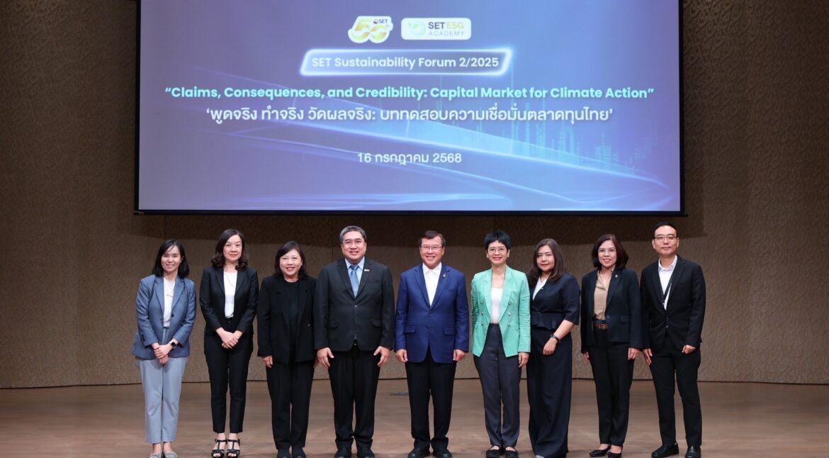 ตลาดหลักทรัพย์แห่งประเทศไทยจัดสัมมนา SET Sustainability Forum ครั้งที่ 2/2568 ภายใต้แนวคิด “Claims, Consequences, and Credibility: Capital Market for Climate Action” ในวันที่ 16 ก.ค. 2568 สะท้อนทิศทางตลาดทุนโลกที่เปลี่ยนจากการให้ความสำคัญกับการตั้งเป้าหมายด้านสภาพภูมิอากาศ (Claims) ขยายสู่การพิสูจน์ความน่าเชื่อถือ (Credibility) ด้วยข้อมูลคุณภาพและการดำเนินการที่วัดผลได้ ซึ่งนำไปสู่ผลลัพธ์ทางการเงินที่ส่งผลต่อความสามารถในการแข่งขันและการเข้าถึงเงินทุนระยะยาว (Consequences) โดยมีผู้บริหารระดับสูงองค์กรชั้นนำร่วมแลกเปลี่ยนมุมมอง