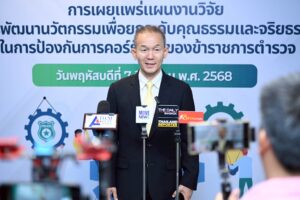 วันที่ 7 สิงหาคม 2568 สำนักงานการวิจัยแห่งชาติ (วช.) กระทรวงการอุดมศึกษา วิทยาศาสตร์ วิจัยและนวัตกรรม ส่งเสริมและสนับสนุนมหาวิทยาลัยราชภัฏนครสวรรค์ และโรงเรียนนายร้อยตำรวจ จัดการประชุมเผยแพร่ผลงานวิจัย “การพัฒนานวัตกรรมเพื่อยกระดับคุณธรรมและจริยธรรมในการป้องกันคอร์รัปชันของข้าราชการตำรวจ” ในการนี้ ดร.วิภารัตน์ ดีอ่อง ผู้อำนวยการสำนักงานการวิจัยแห่งชาติ มอบหมายให้ ศาสตราจารย์ พลตำรวจตรีหญิง ดร.พัชรา สินลอยมา ประธานคณะผู้ตรวจสอบทางวิชาการแผนงานเสริมสร้างธรรมาภิบาลและแก้ไขปัญหาคอร์รัปชัน ผู้ทรงคุณวุฒิ วช. เข้าร่วมการประชุม โดยมี ศาสตราจารย์ พลตำรวจตรี ดร.ชัชนันท์ ลีระเติมพงษ์ รองผู้บัญชาการโรงเรียนนายร้อยตำรวจ กล่าวเปิดโครงการ พร้อมด้วย รองศาสตราจารย์ ดร.สุวรรณา คุณดิลกณัฐวสา มหาวิทยาลัยราชภัฏนครสวรรค์ หัวหน้าโครงการวิจัยและนวัตกรรม กล่าวรายงาน ณ โรงแรมรอยัล ริเวอร์ กรุงเทพมหานคร