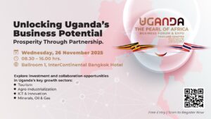 สถานเอกอัครราชทูตยูกันดา ประจำกรุงกัวลาลัมเปอร์ แจ้งว่า ทางสถานทูตฯ ซึ่งมีเขตอาณาครอบคลุมราชอาณาจักรไทย เตรียมจัดงาน “The Pearl of Africa – Uganda Business Forum & Expo 2025 – Thailand Chapter” ภายใต้แนวคิด “Unlocking Uganda’s Business Potential: Prosperity Through Partnerships” ในวันที่ 26 พฤศจิกายน 2568 ณ โรงแรมอินเตอร์คอนติเนนตัล กรุงเทพฯ