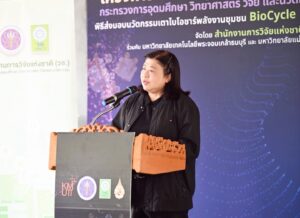 ดร.วิภารัตน์ ดีอ่อง ผู้อำนวยการสำนักงานการวิจัยแห่งชาติ กล่าวว่า นวัตกรรมเตาไบโอชาร์พลังงานชุมชน BioCycle Kiln เป็นเครื่องมือสำคัญในการบริหารจัดการเศษวัสดุเหลือใช้ทางการเกษตรให้เกิดประโยชน์สูงสุด โดยนำมาแปรรูปเป็นไบโอชาร์เพื่อปรับปรุงคุณภาพดิน ลดต้นทุนการผลิต และเพิ่มมูลค่าทางเศรษฐกิจแก่เกษตรกร ทั้งนี้ กลุ่มเกษตรกรชุมชนบ้านน้ำพุมีความเข้มแข็งและมีศักยภาพในการประยุกต์ใช้องค์ความรู้สู่การปฏิบัติจริง สามารถต่อยอดการพัฒนาองค์ความรู้และนวัตกรรมดังกล่าวใช้ประโยชน์ทั้งในมิติเศรษฐกิจควบคู่กับการดูแลสิ่งแวดล้อม ลดปัญหาการเผาในที่โล่งซึ่งเป็นสาเหตุสำคัญของปัญหาฝุ่นละออง PM2.5 และลดผลกระทบต่อสุขภาพของประชาชน