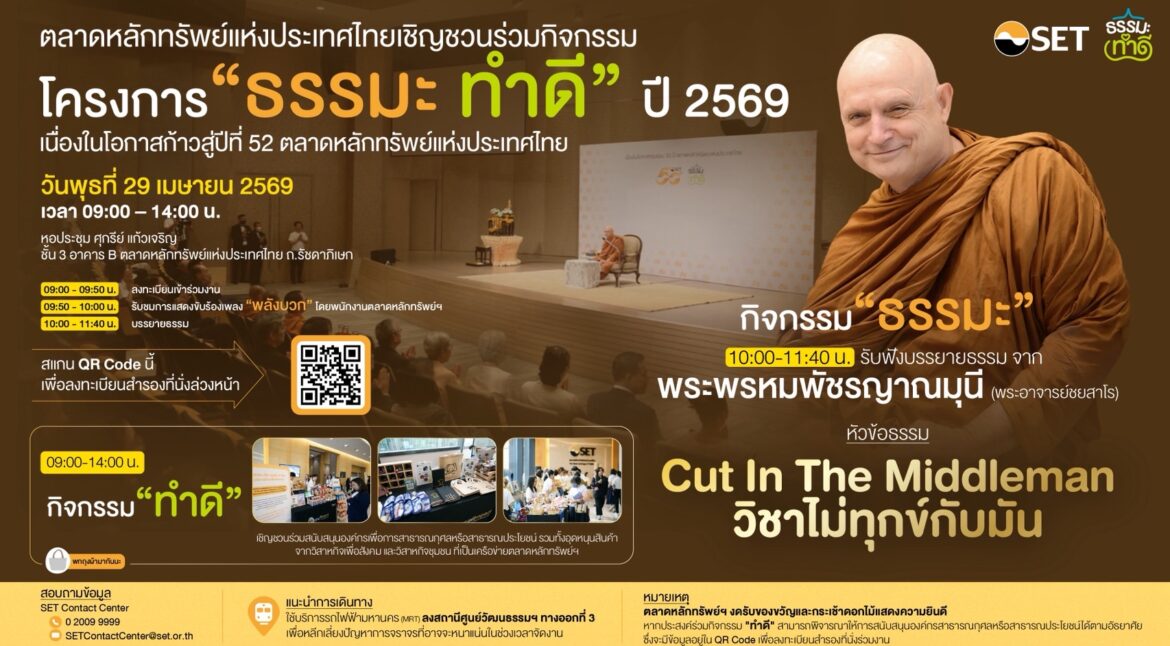 ตลาดหลักทรัพย์แห่งประเทศไทย ชวนผู้ลงทุน ประชาชน และผู้สนใจร่วมกิจกรรมโครงการ “ธรรมะ ทำดี ปี 2569” เนื่องในโอกาสก้าวสู่ปีที่ 52 ตลาดหลักทรัพย์ฯ กำหนดจัดขึ้นในวันพุธที่ 29 เมษายน 2569 เวลา 09.00 – 14.00 น. ณ อาคารตลาดหลักทรัพย์ฯ โดยแบ่งเป็น 2 กิจกรรม ได้แก่